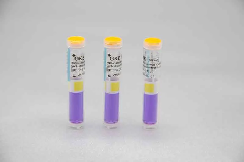 GKE Mini-Bio-Plus self-contained biological indicators (SCBI) for validation and routine monitoring in special process challenge devices (PCDs), for steam sterilization processes 121°C and 134°C for steam sterilization processes