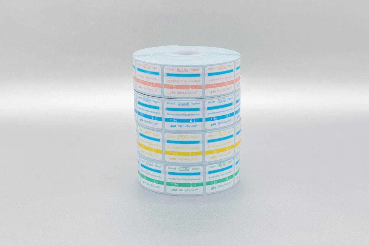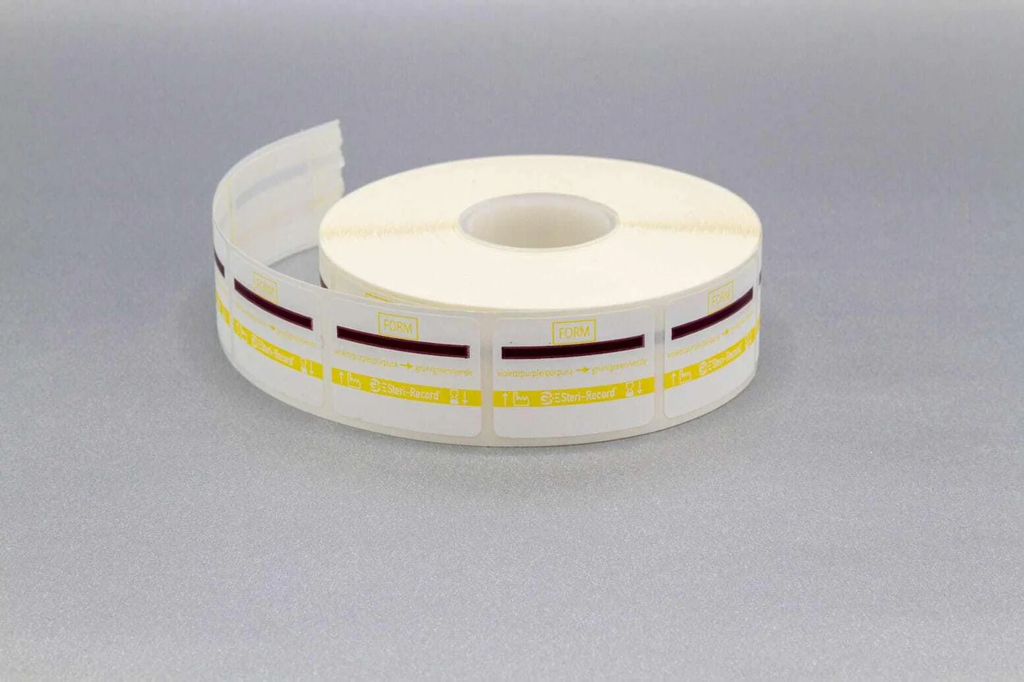 • 3-line double-adhesive labels with type 1 indicator according to EN ISO 11140-1 for steam sterilization processes, available in four colors (red, green, blue, yellow)