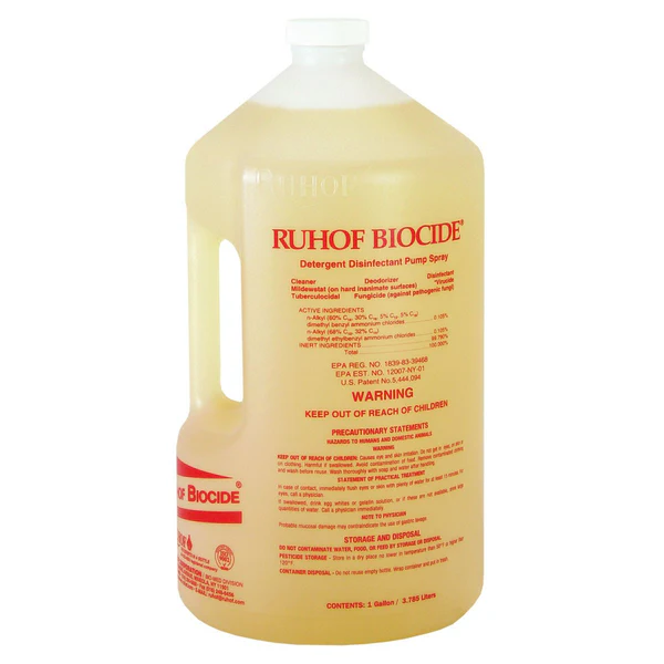 Ruhof Biocide® is a ready-to-use quaternary germicide cleaner and disinfectant for use in patient rooms, operating rooms, IGU areas, public restrooms, or any other area that needs to be disinfected. It is formulated to be highly effective against a broad-spectrum of pathogenic microorganisms, including bacteria, antibiotic resistant bacteria, viruses, fungi, mold and mildew.