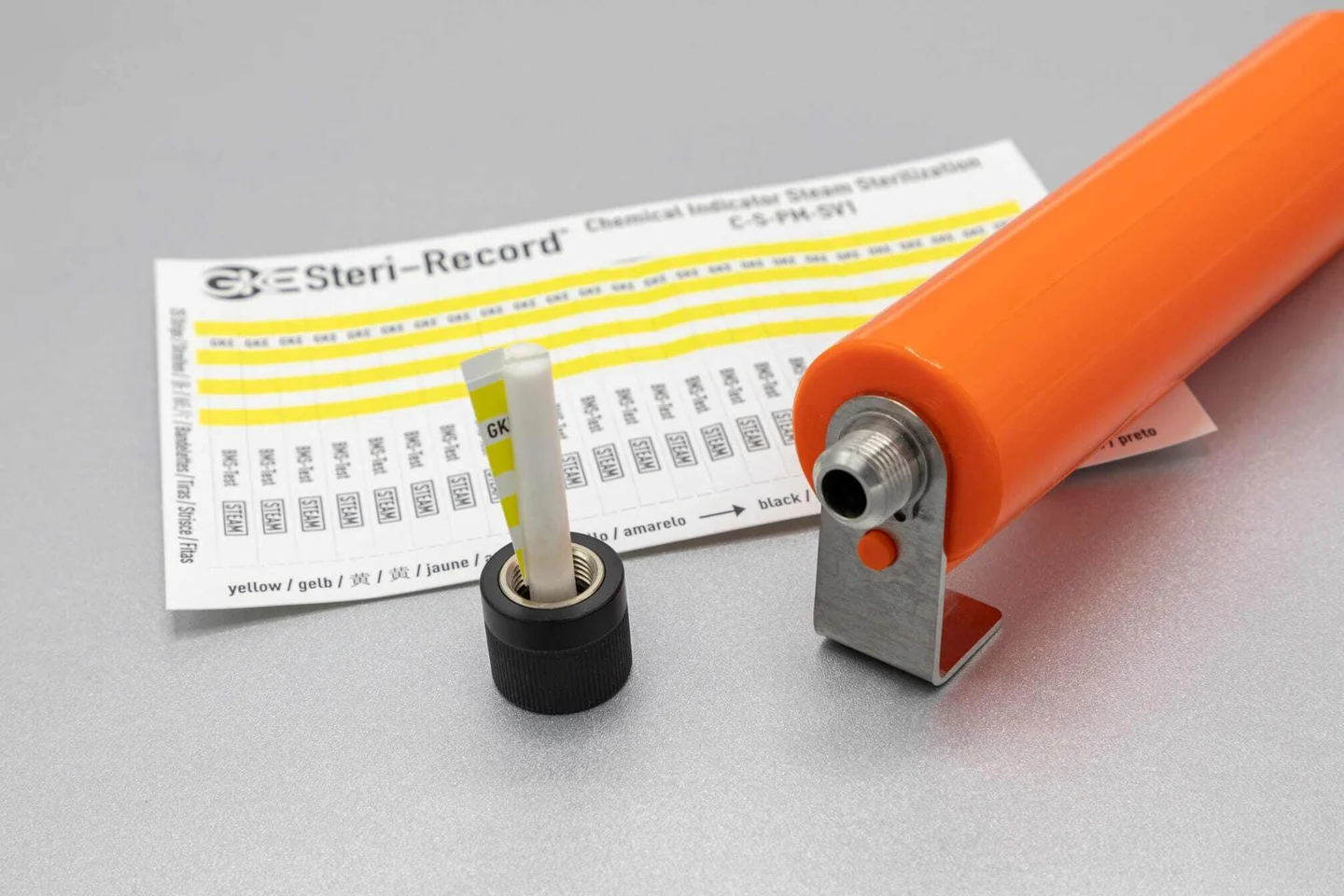• Indicator system according to DIN EN ISO 11140-1 Type 2, consisting of a permanently reusable test specimen and matching indicator strips